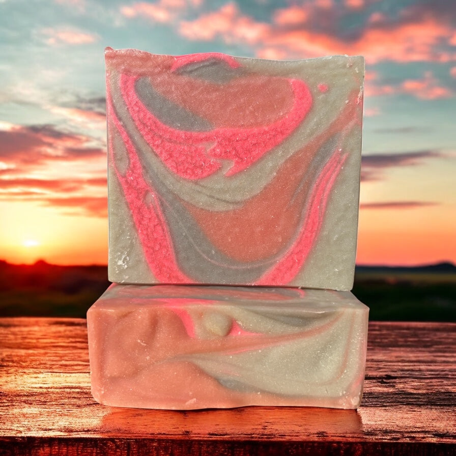 Luxurious goat milk soap that will remind you of a desert sunset! A refreshing blend of floral, coconut, and citrus on a base of musk and sandalwood.